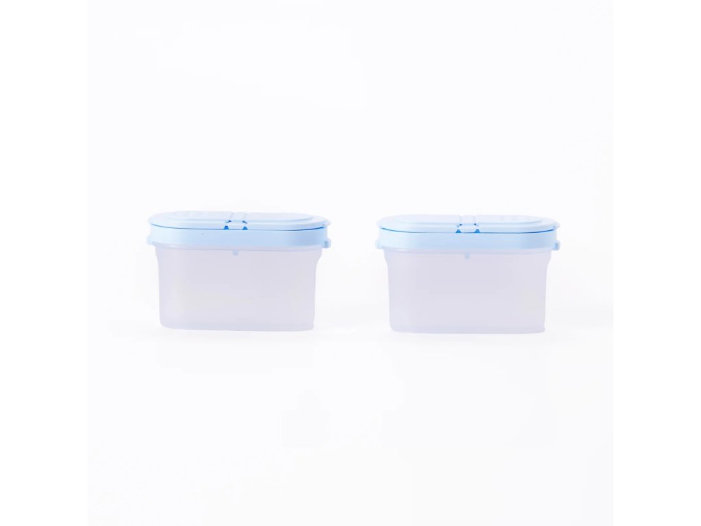 - ze dvou stejně velkých nádobek, které jsou na kratších stranách průhledné, takže na první pohled vidíte obsah i množství uvnitř,