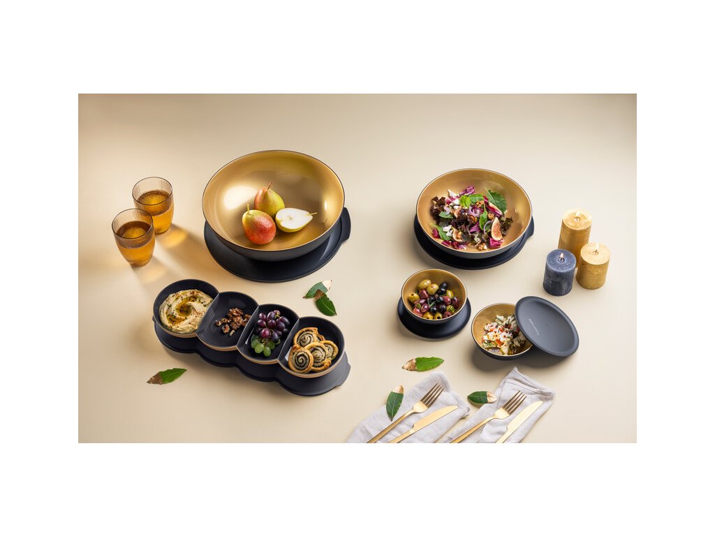 Allegra housenka nejen, že při stolování hezky vypadá, ale zároveň je praktická, protože tato sada obsahuje i nízkou housenku, kterou dobroty jednoduše přiklopíme, aby nám neokoraly.